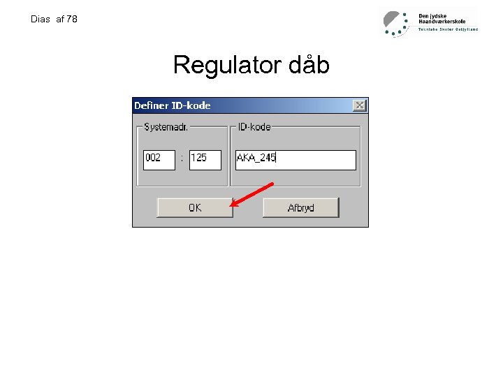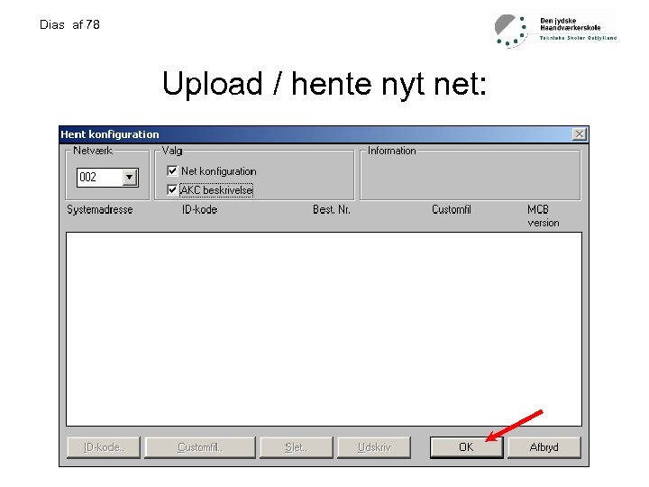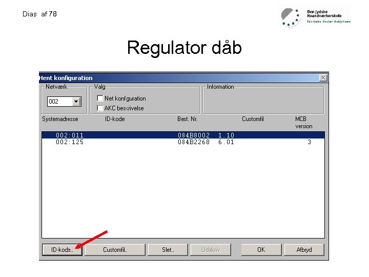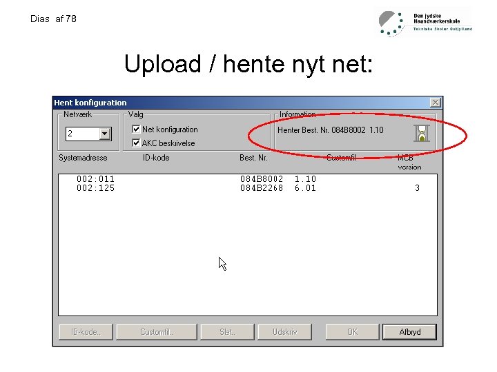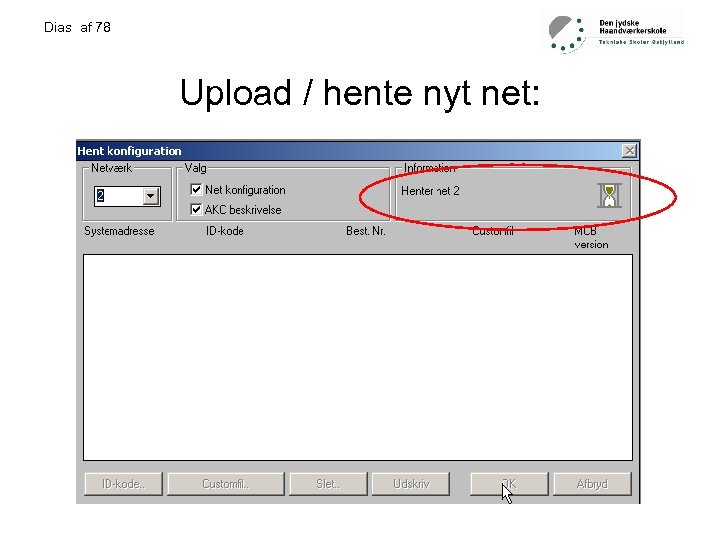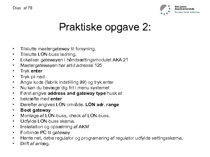 Dias af 78 Praktiske opgave 2: • • • • • Tilslutte mastergateway til forsyning. Tilslutte LON-buss ledning. Lokaliser gatewayen i håndsættingsmodulet AKA 21 Mastergatewayen har altid adresse 125 Tryk enter Tryk pil ned Angiv kode (fabrik indstilling 99) og tryk enter Nu kan du bevæge dig frit i menu systemet Først angive address and gateway type husk at bekræfte med enter Derefter angives LON område. LON adr. range Boot gateway Montage af LON-buss, check af LON-buss. Udfylde LON-buss skema. Installation og opsætning af AKM Forbinde PC til gateway Hente net, døbe regulator og programering af regulator udfylde settingsskema. Drift af anlæg.
