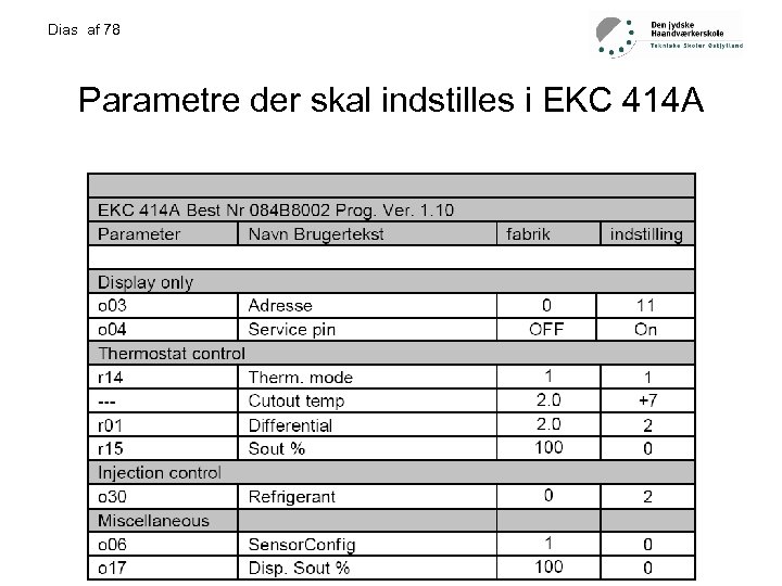 Dias af 78 Parametre der skal indstilles i EKC 414 A