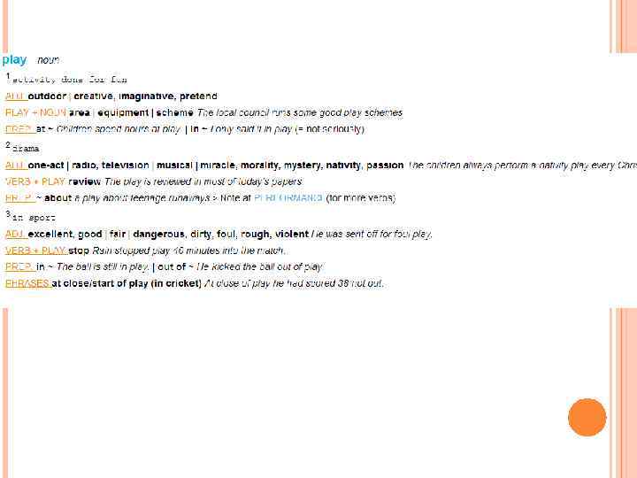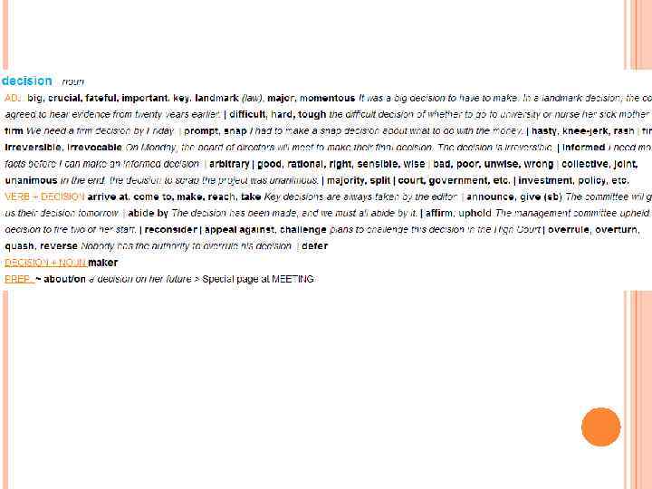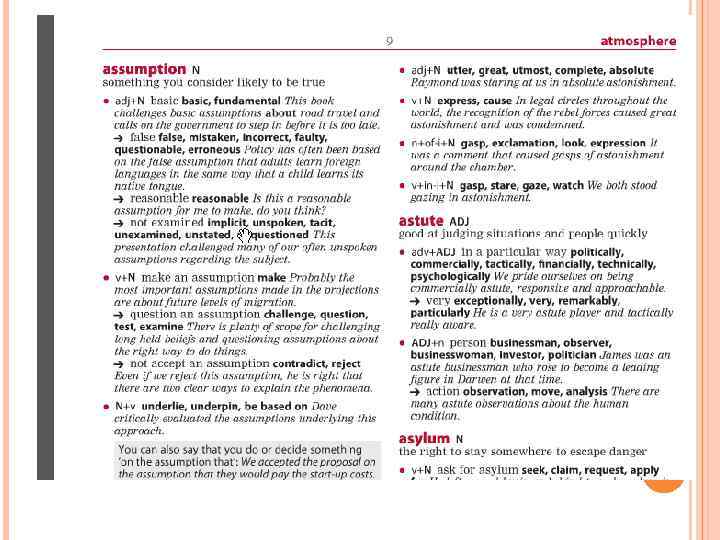 The MCD Entries in the MCD are divided up in two ways first by grammar, then by meaning. The entry for assumption shows collocations for three types of ‘grammatical relation’: v adj+ N- adjectives that often collocate with assumption such as basic, incorrect or implicit ; v. V+ N-verbs that often have assumption as their object such as make, challenge or reject; v N+ v- verbs where assumption is often the subject such as underlie or underpin.