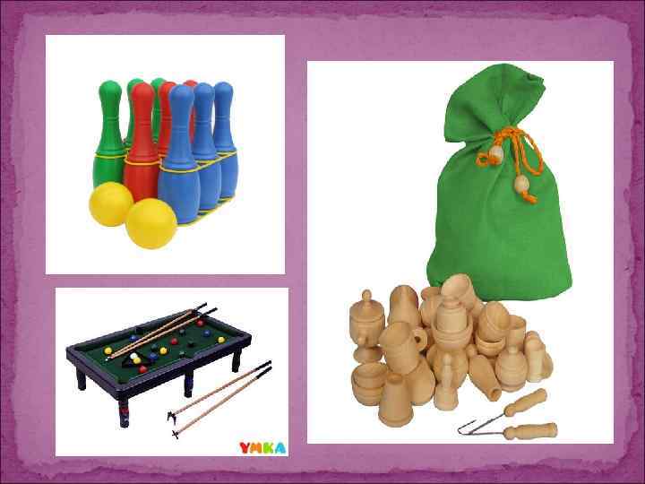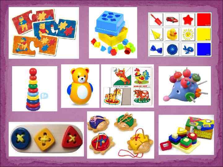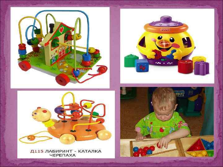 Для малышей используются многочисленные варианты игр с прокатыванием шариков по желобку, с горки, в воротца, а также игры с вкладышами, разборными яйцами, шарами, башенками.
