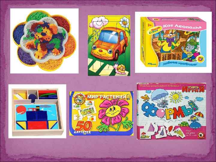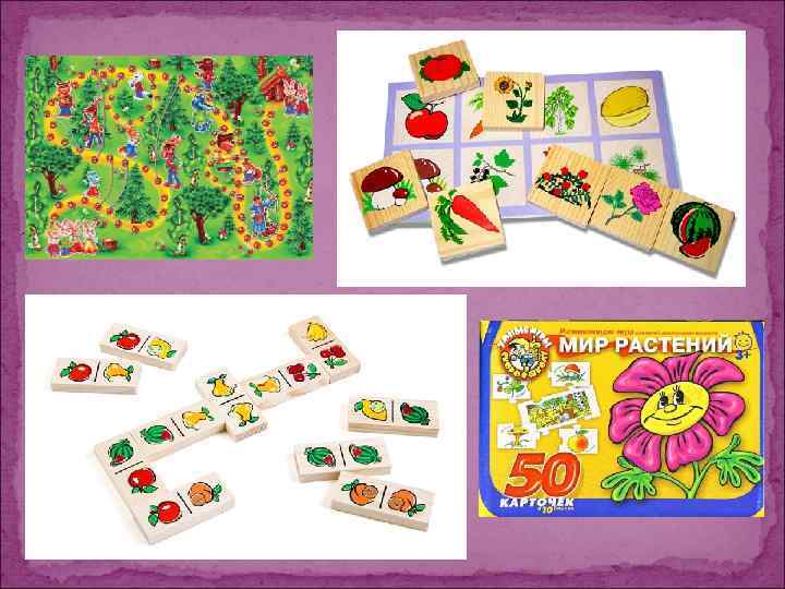 Настольно-печатные игры Помогают уточнять и расширять представления детей об окружающем мире, систематизировать знания, развивать мыслительные процессы. Среди дидактических игр для дошкольников преобладают игры, в основе которых лежит парность картинок, подбираемых по сходству. Сначала детям предлагают игры, в которых требуется подобрать из множества картинок пары совершенно одинаковых. Далее задача усложняется: картинки надо объединить по смыслу (найти две машины, из которых одна легковая, другая грузовая). Наконец, старшим дошкольникам целесообразно предлагать отыскивать пары среди предметов, отличающихся друг от друга пространственным расположением, формой, особенностями окраски. Распространены настольно печатные игры, устроенные по принципу разрезных картинок, складных кубиков, на которых изображенный предмет или сюжет делится на несколько частей. Эти игры способствуют развитию логического мышления, сосредоточенности, внимания.