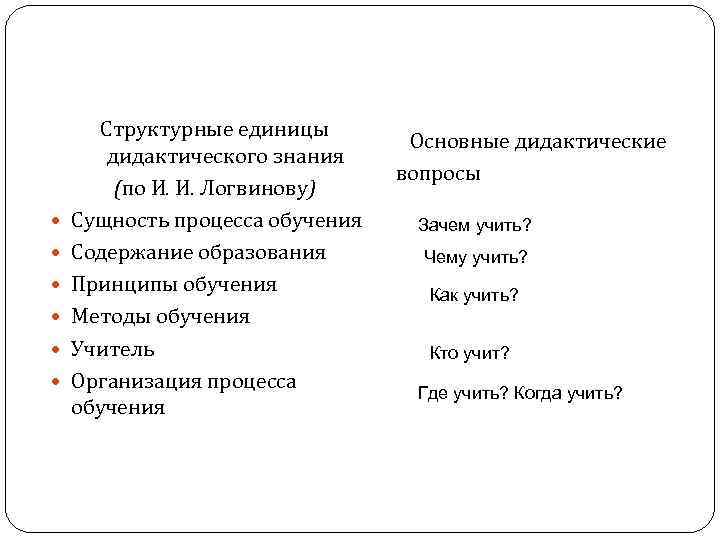 Структурные единицы дидактического знания (по И. И. Логвинову) Сущность процесса обучения Содержание образования Принципы обучения Методы обучения Учитель Организация процесса обучения Основные дидактические вопросы Зачем учить? Чему учить? Как учить? Кто учит? Где учить? Когда учить?