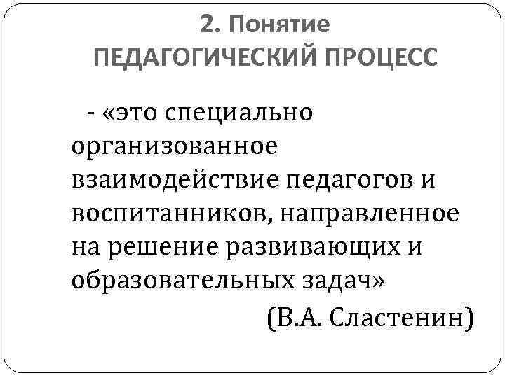 2. Понятие ПЕДАГОГИЧЕСКИЙ ПРОЦЕСС - «это специально организованное взаимодействие педагогов и воспитанников, направленное на решение развивающих и образовательных задач» (В. А. Сластенин)