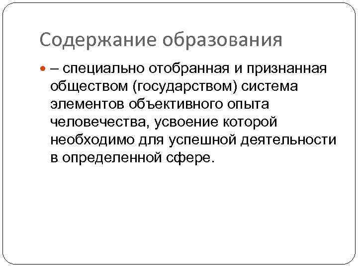 Содержание образования – специально отобранная и признанная обществом (государством) система элементов объективного опыта человечества, усвоение которой необходимо для успешной деятельности в определенной сфере.