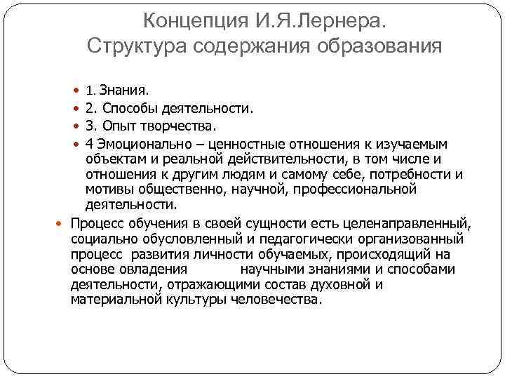 Концепция И. Я. Лернера. Структура содержания образования 1. Знания. 2. Способы деятельности. 3. Опыт творчества. 4 Эмоционально – ценностные отношения к изучаемым объектам и реальной действительности, в том числе и отношения к другим людям и самому себе, потребности и мотивы общественно, научной, профессиональной деятельности. Процесс обучения в своей сущности есть целенаправленный, социально обусловленный и педагогически организованный процесс развития личности обучаемых, происходящий на основе овладения научными знаниями и способами деятельности, отражающими состав духовной и материальной культуры человечества.