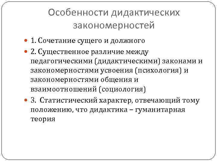 Особенности дидактических закономерностей 1. Сочетание сущего и должного 2. Существенное различие между педагогическими (дидактическими) законами и закономерностями усвоения (психология) и закономерностями общения и взаимоотношений (социология) 3. Статистический характер, отвечающий тому положению, что дидактика – гуманитарная теория