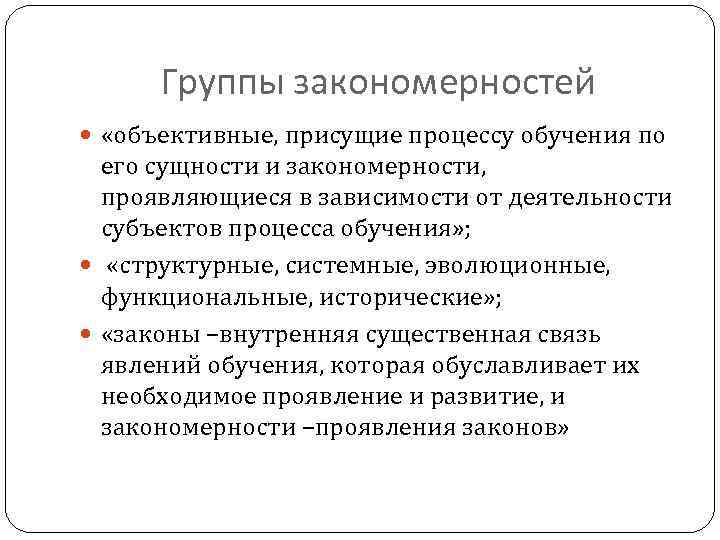 Группы закономерностей «объективные, присущие процессу обучения по его сущности и закономерности, проявляющиеся в зависимости от деятельности субъектов процесса обучения» ; «структурные, системные, эволюционные, функциональные, исторические» ; «законы –внутренняя существенная связь явлений обучения, которая обуславливает их необходимое проявление и развитие, и закономерности –проявления законов»