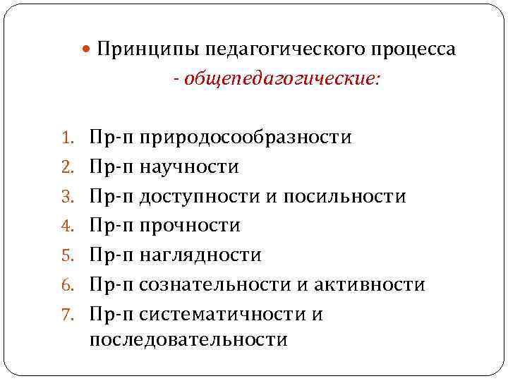 Принципы педагогического процесса - общепедагогические: 1. Пр-п природосообразности 2. Пр-п научности 3. Пр-п доступности и посильности 4. Пр-п прочности 5. Пр-п наглядности 6. Пр-п сознательности и активности 7. Пр-п систематичности и последовательности