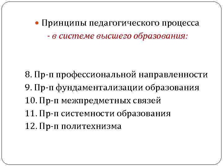 Принципы педагогического процесса - в системе высшего образования: 8. Пр-п профессиональной направленности 9. Пр-п фундаментализации образования 10. Пр-п межпредметных связей 11. Пр-п системности образования 12. Пр-п политехнизма