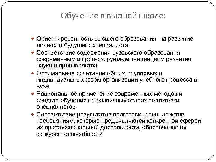 Обучение в высшей школе: Ориентированность высшего образования на развитие личности будущего специалиста Соответствие содержания вузовского образования современным и прогнозируемым тенденциям развития науки и производства Оптимальное сочетание общих, групповых и индивидуальных форм организации учебного процесса в вузе Рациональное применение современных методов и средств обучения на различных этапах подготовки специалистов Соответствие результатов подготовки специалистов требованиям, которые предъявляются конкретной сферой их профессиональной деятельности, обеспечение их конкурентоспособности