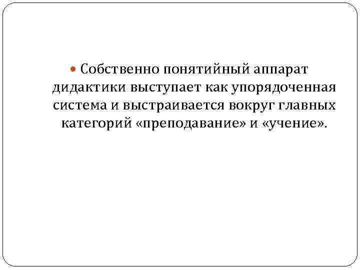 Собственно понятийный аппарат дидактики выступает как упорядоченная система и выстраивается вокруг главных категорий «преподавание» и «учение» .