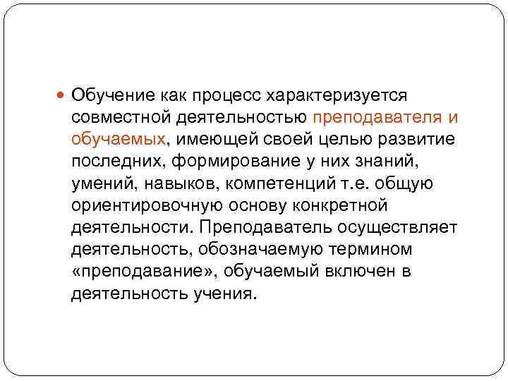 Обучение как процесс характеризуется совместной деятельностью преподавателя и обучаемых, имеющей своей целью развитие последних, формирование у них знаний, умений, навыков, компетенций т. е. общую ориентировочную основу конкретной деятельности. Преподаватель осуществляет деятельность, обозначаемую термином «преподавание» , обучаемый включен в деятельность учения.
