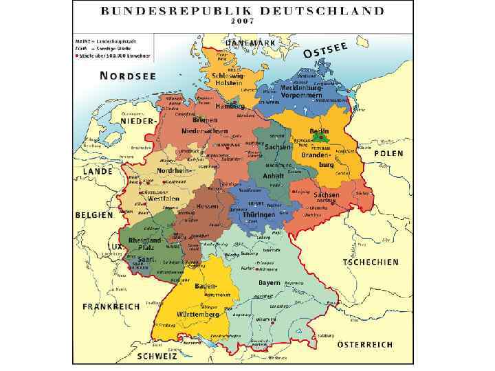 Deutsche Bundesländer und ihre Hauptstädte 1. Baden-Württemberg (Stuttgart) Баден-Вюртемберг (Штутгарт) 2. Freistaat Bayern (München) Свободное государство Бавария (Мюнхен) 3. Berlin Берлин 4. Brandenburg (Potsdam) Бранденбург (Потсдам) 5. Freie Hansestadt Bremen (Bremen) Свободный ганзейский город Бремен 6. Freie und Hansestadt Hamburg (Hamburg) Свободный и ганзейский город Гамбург 7. Hessen (Wiesbaden) Гессен (Висбаден) 8. Mecklenburg-Vorpommern (Schwerin) Мекленбург-Передняя Померания (Шверин) 9. Niedersachsen (Hannover) Нижняя Саксония (Ганновер) 10. Nordrhein-Westfalen (Düsseldorf) Северный Рейн-Вестфалия (Дюссельдорф) 11. Rheinland-Pfalz (Mainz) Рейнланд-Пфальц (Майнц) 12. Saarland (Saarbrücken) Саар (Саарбрюккен) 13. Freistaat Sachsen (Dresden) Свободное государство Саксония (Дрезден) 14. Sachsen-Anhalt (Magdeburg) Саксония-Анхальт (Магдебург) 15. Schleswig-Holstein (Kiel) Шлезвиг-Гольштейн (Киль) 16. Freistaat Thüringen (Erfurt) Свободное государство Тюрингия (Эрфурт)