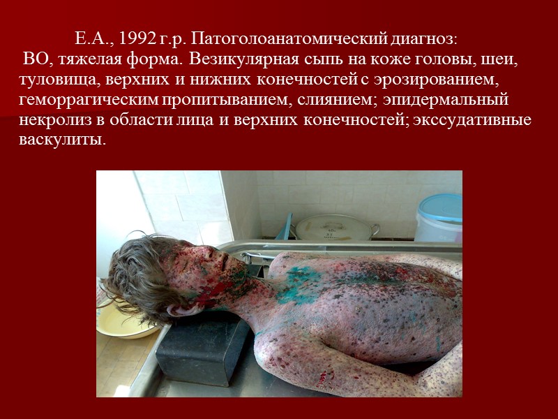 Е.А., 1992 г.р. Патоголоанатомический диагноз: ВО, тяжелая форма. Везикулярная сыпь на коже головы, шеи, туловища, верхних и нижних конечностей с эрозированием, геморрагическим пропитыванием, слиянием; эпидермальный некролиз в области лица и верхних конечностей; экссудативные васкулиты.