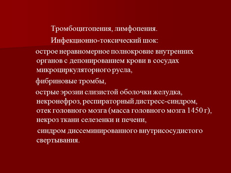 Тромбоцитопения, лимфопения. Инфекционно-токсический шок: острое неравномерное полнокровие внутренних органов с депонированием крови в сосудах микроциркуляторного русла, фибриновые тромбы, острые эрозии слизистой оболочки желудка, некронефроз, респираторный дистресс-синдром, отек головного мозга (масса головного мозга 1450 г), некроз ткани селезенки и печени, синдром диссеминированного внутрисосудистого свертывания.