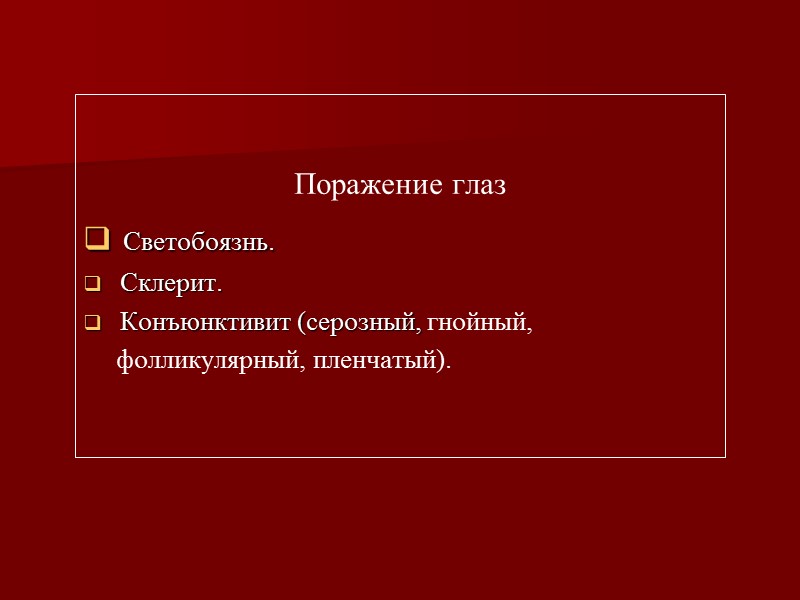 Поражение глаз Светобоязнь. Склерит. Конъюнктивит (серозный, гнойный, фолликулярный, пленчатый).