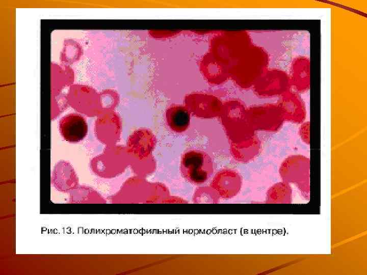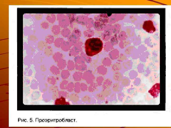Морфология клеток эритроцитарного ряда. а Эритробласт; б — пронормобласт; в — нормобласт базофильный; г — нормо бласт полихроматофильный; д—нормобласт оксифильный; е — эритроциты с ядерными дериватами (тельца Жолли)