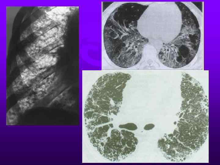 Рентгенологические признаки • диффузные билатеральные затемнения которые имеют неоднородный пятнистый характер. • плевральный выпот обычно отсутствует. • На КТ • двухсторонние симметричные, преимущественно субплевральные негомогенные области "матового стекла", • участки уплотнения воздушных пространств • расширение бронхиол на фоне нарушения нормальной архитектоники легких. • нарушения структуры бронхососудистых пучков, • тракционные бронхоэктазы.