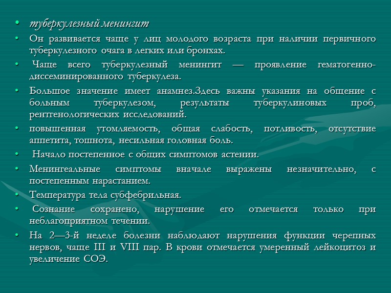 туберкулезный менингит Он развивается чаще у лиц молодого возраста при наличии первичного туберкулезного очага в легких или бронхах. Чаще всего туберкулезный менингит — проявление гематогенно-диссеминированного туберкулеза. Большое значение имеет анамнез.Здесь важны указания на общение с больным туберкулезом, результаты туберкулиновых проб, рентгенологических исследований. повышенная утомляемость, общая слабость, потливость, отсутствие аппетита, тошнота, несильная головная боль. Начало постепенное с общих симптомов астении. Менингеальные симптомы вначале выражены незначительно, с постепенным нарастанием. Температура тела субфебрильная. Сознание сохранено, нарушение его отмечается только при неблагоприятном течении. На 2—3-й неделе болезни наблюдают нарушения функции черепных нервов, чаще III и VIII пар. В крови отмечается умеренный лейкоцитоз и увеличение СОЭ.
