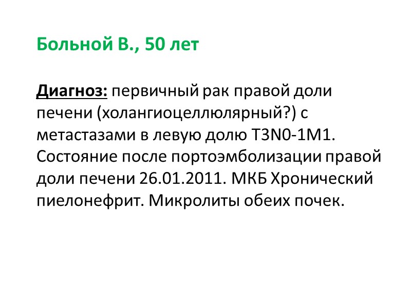 Больной В., 50 лет Диагноз: первичный рак правой доли печени (холангиоцеллюлярный?) с метастазами в левую долю T3N0-1M1. Состояние после портоэмболизации правой доли печени 26.01.2011. МКБ Хронический пиелонефрит. Микролиты обеих почек.