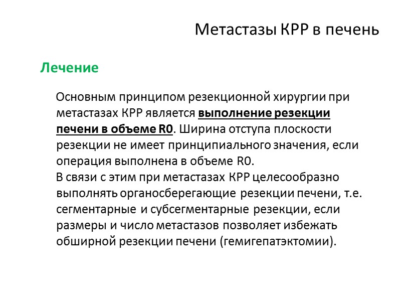 Метастазы КРР в печень Лечение Основным принципом резекционной хирургии при метастазах КРР является выполнение резекции печени в объеме R0. Ширина отступа плоскости резекции не имеет принципиального значения, если операция выполнена в объеме R0. В связи с этим при метастазах КРР целесообразно выполнять органосберегающие резекции печени, т.е. сегментарные и субсегментарные резекции, если размеры и число метастазов позволяет избежать обширной резекции печени (гемигепатэктомии).