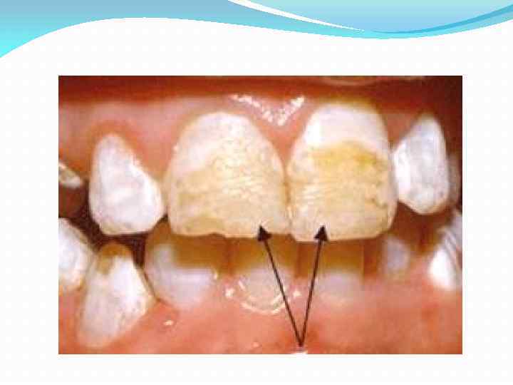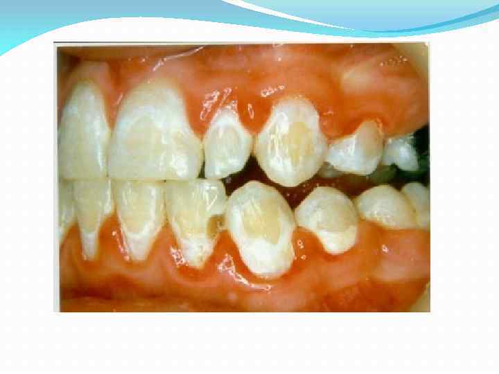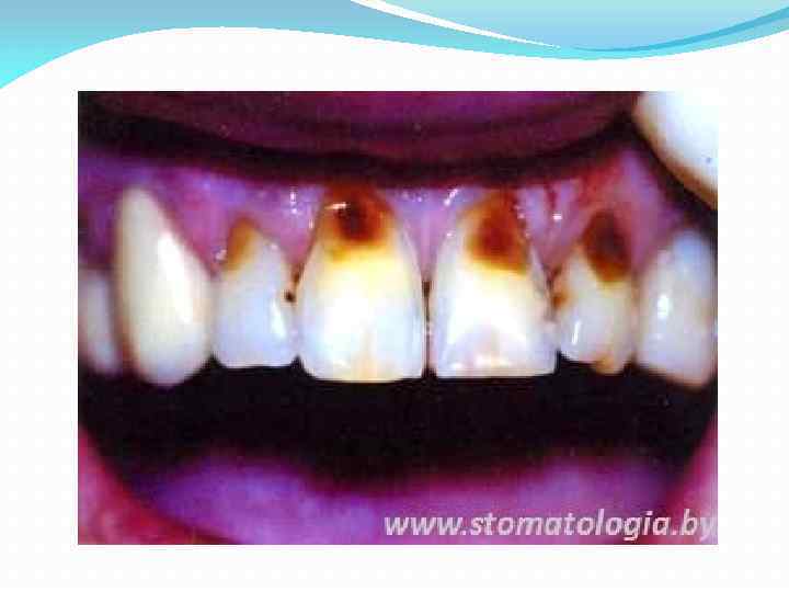 3) При гипоплазии, пятна множественные и локализуются по всей поверхности зубов. Пятна белого цвета, с чёткими границами, имеют гладкую блестящую поверхность, не окрашиваются красителями. Не прогрессируют, проявляются сразу после прорезывания зубов.
