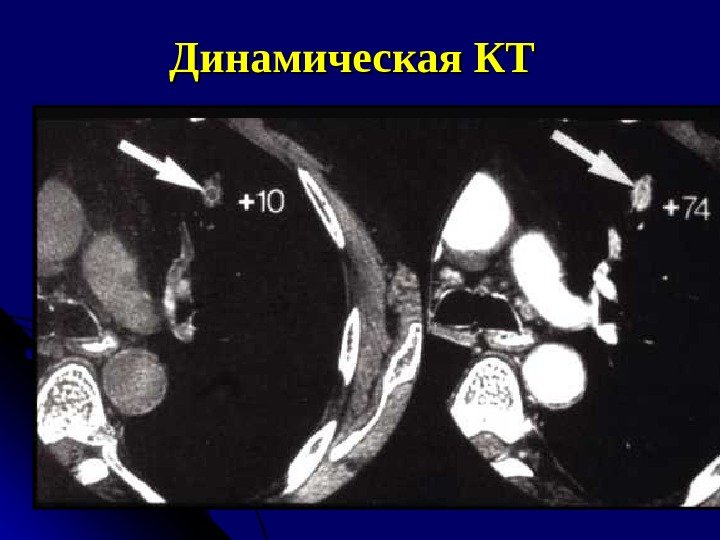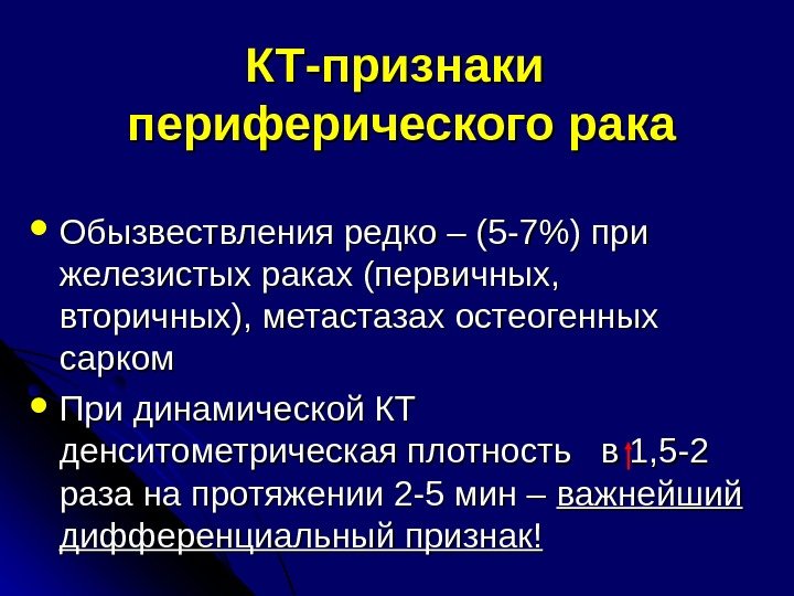 КТ-признаки периферического рака Обызвествления редко – (5 -7%) при железистых раках (первичных, вторичных), метастазах остеогенных сарком При динамической КТ денситометрическая плотность в 1, 5 -2 раза на протяжении 2 -5 мин – важнейший дифференциальный признак!