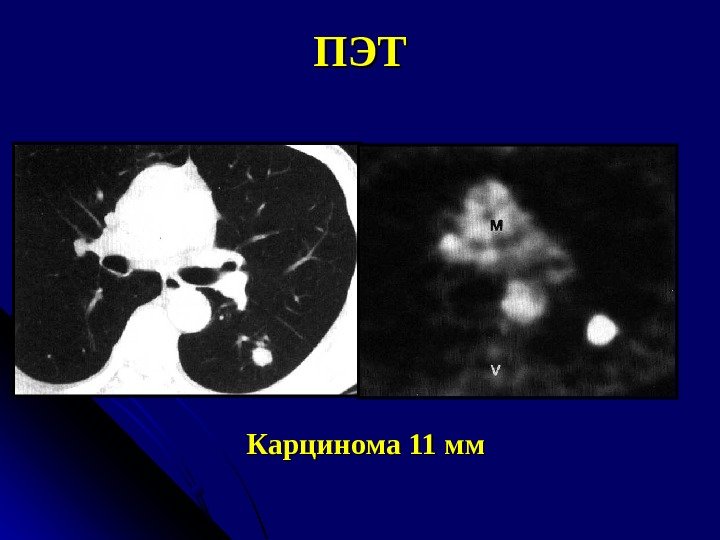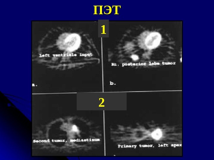 Биология ООЛ Большинство раковых узлов в легких чувствительно к глюкозе Радиоактивная глюкоза может быть использована в дифференциации зло- или доброкачественности образования Для ООЛ > 10 мм, чувствительность 94 -96%, специфичность 87 -88% Применение ПЭТ позволяет визуализировать ООЛ > 7 мм