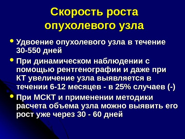 Скорость роста опухолевого узла Удвоение опухолевого узла в течение 30 -550 дней При динамическом наблюдении с помощью рентгенографии и даже при КТ увеличение узла выявляется в течении 6 -12 месяцев — в 25% случаев (-) При МСКТ и применении методики расчета объема узла можно выявить его рост уже через 30 — 60 дней