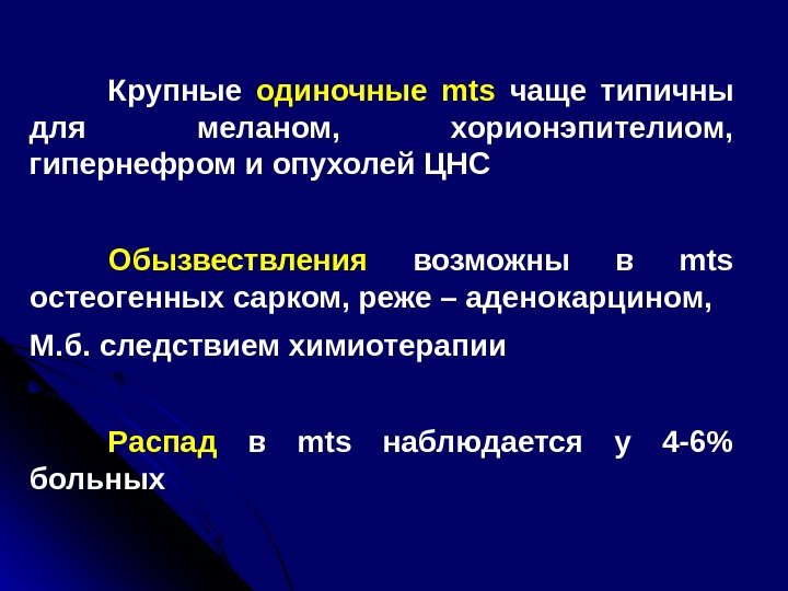 Крупные одиночные mts чаще типичны для меланом, хорионэпителиом, гипернефром и опухолей ЦНС Обызвествления возможны в mts остеогенных сарком, реже – аденокарцином, М. б. следствием химиотерапии Распад в mts наблюдается у 4 -6% больных