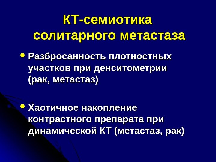 КТ-семиотика солитарного метастаза Разбросанность плотностных участков при денситометрии (рак, метастаз) Хаотичное накопление контрастного препарата при динамической КТ (метастаз, рак)