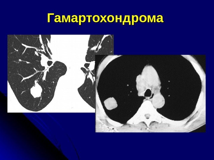 Р и КТ-признаки гамартохондром Любого размера В любом отделе Контуры – ровные, волнистые, четкие Наличие участков повышенной плотности в центре (хрящевые включения) – патогномоничный признак