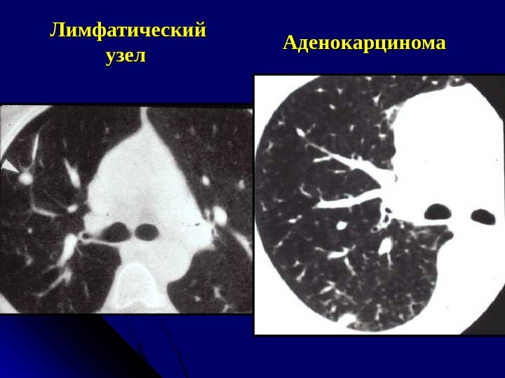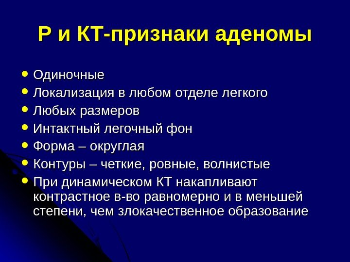 Р и КТ-признаки аденомы Одиночные Локализация в любом отделе легкого Любых размеров Интактный легочный фон Форма – округлая Контуры – четкие, ровные, волнистые При динамическом КТ накапливают контрастное в-во равномерно и в меньшей степени, чем злокачественное образование