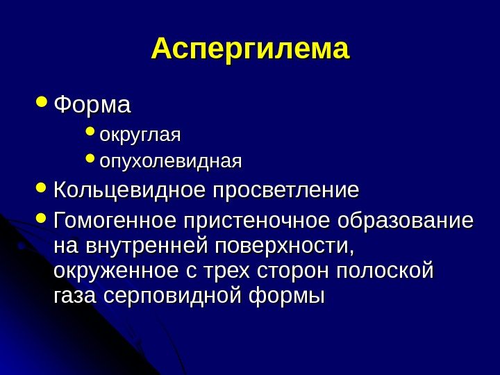 Аспергилема Форма округлая опухолевидная Кольцевидное просветление Гомогенное пристеночное образование на внутренней поверхности, окруженное с трех сторон полоской газа серповидной формы