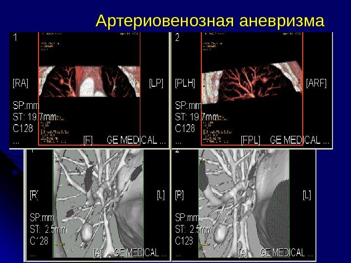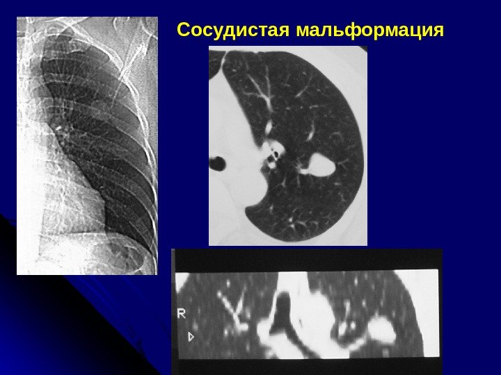 Р и КТ-признаки артериовенозной мальформации Случайная находка Молодой возраст Частое сочетание с пороками ССС Конгломераты полостей с кровью (расширенные артериальные и венозные сосуды) Полость 3 -5 см и резко расширенные капилляры, образующие мелкие полости Расширение приводящих и отводящих сосудов