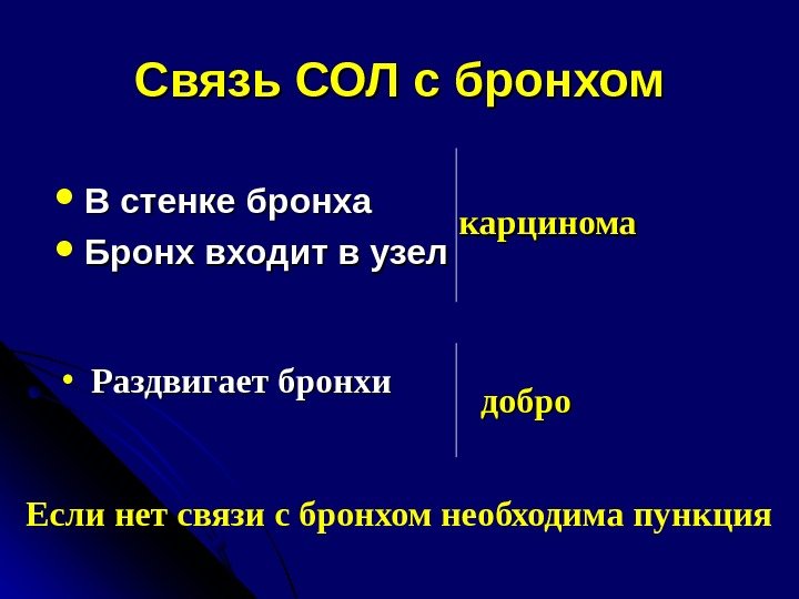 Связь СОЛ с бронхом В стенке бронха Бронх входит в узел • Раздвигает бронхи карцинома добро Если нет связи с бронхом необходима пункция