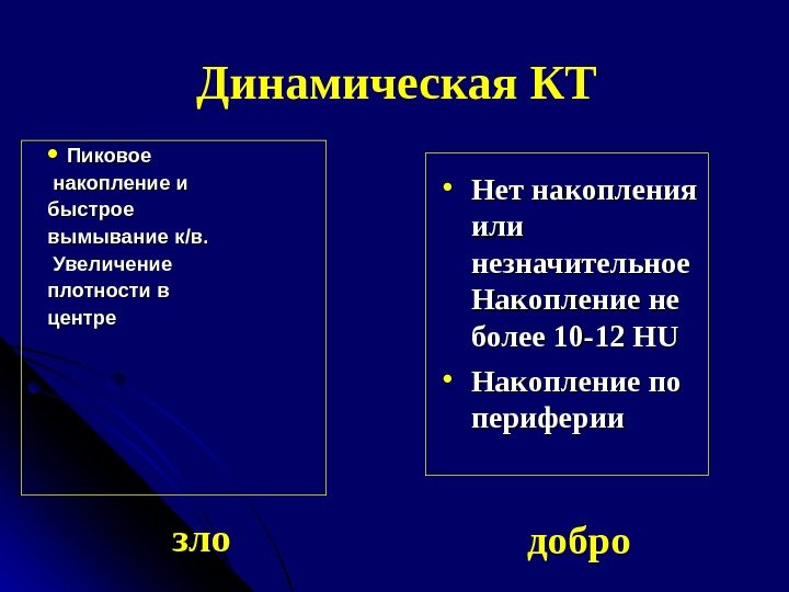 Пиковое накопление и быстрое вымывание к // в. в. Увеличение плотности в центре добро • Нет накопления или незначительное Накопление не более 10 -12 Н UU • Накопление по периферии зло Динамическая КТ