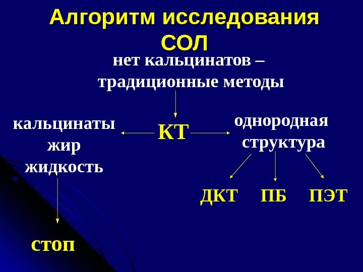 Алгоритм исследования СОЛСОЛ нет кальцинатов – традиционные методы КТкальцинаты жир жидкость стоп однородная структура ДКТ ПБ ПЭТ