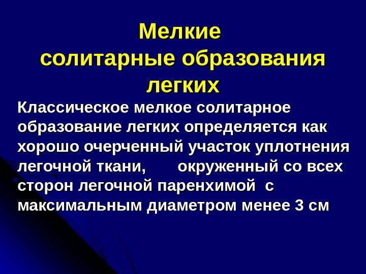Мелкие солитарные образования легких Классическое мелкое солитарное образование легких определяется как хорошо очерченный участок уплотнения легочной ткани, окруженный со всех сторон легочной паренхимой с максимальным диаметром менее 3 см