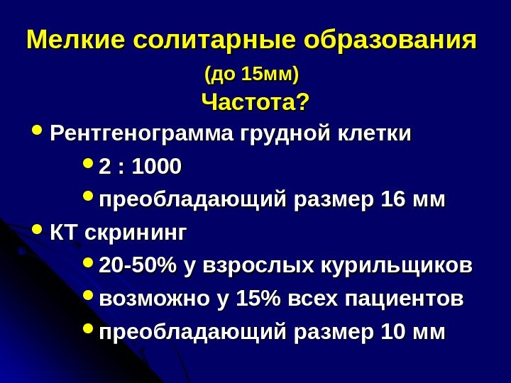 Мелкие солитарные образования (до 15 мм) Частота? Рентгенограмма грудной клетки 2 : 1000 преобладающий размер 16 мм КТ скрининг 20 -50% у взрослых курильщиков возможно у 15% всех пациентов преобладающий размер 10 мм