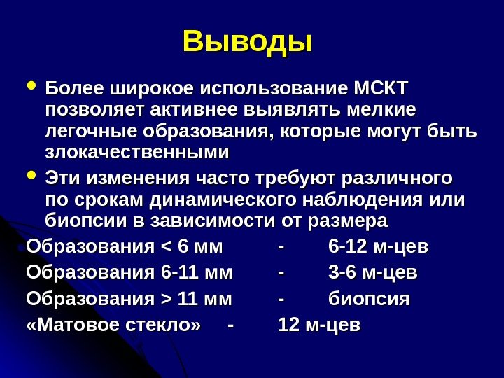 Выводы Более широкое использование MСКТ позволяет активнее выявлять мелкие легочные образования, которые могут быть злокачественными Эти изменения часто требуют различного по срокам динамического наблюдения или биопсии в зависимости от размера Образования < 11 мм — — биопсия «Матовое стекло» — — 12 м-цев