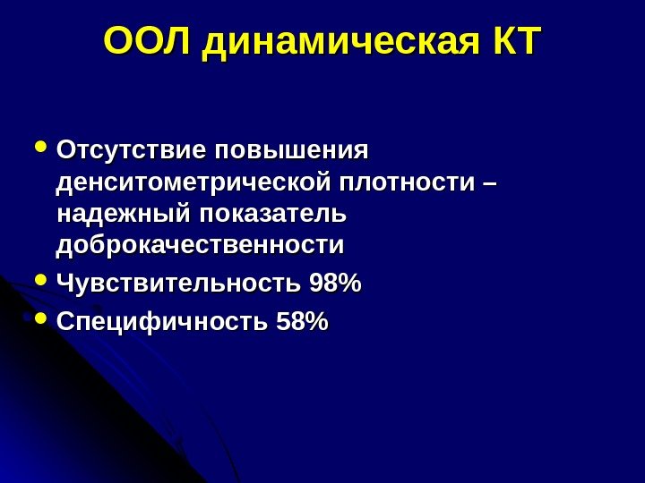 ООЛ динамическая КТ Отсутствие повышения денситометрической плотности – надежный показатель доброкачественности Чувствительность 98% Специфичность 58%