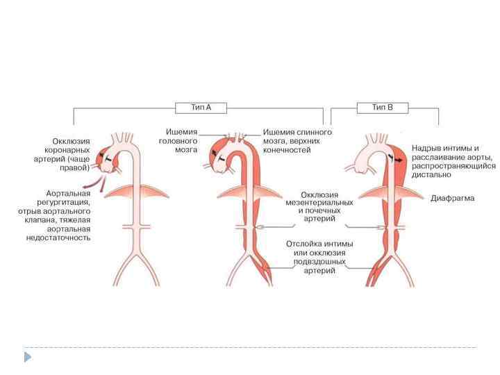 Расслаивающая аневризма аорты — разрыв аорты, который приводит к тому, что кровь затекает между слоями стенок аорты и расслаивает их дальше. Если расслоение прорывает стенку аорты полностью (все три слоя), то происходит быстрая массивная кровопотеря. В более чем 90% случаев это приводит к смерти, даже если вовремя начато правильное лечение. при надрыве интимы — боль и коллаптоидные реакции; при расслоении стенки аорты — резкая мигрирующая боль, анемизация, органные симптомы, повторные коллаптоидные реакции; при полном разрыве стенки сосуда — признаки внутреннего кровотечения и терминальный геморрагический шок.