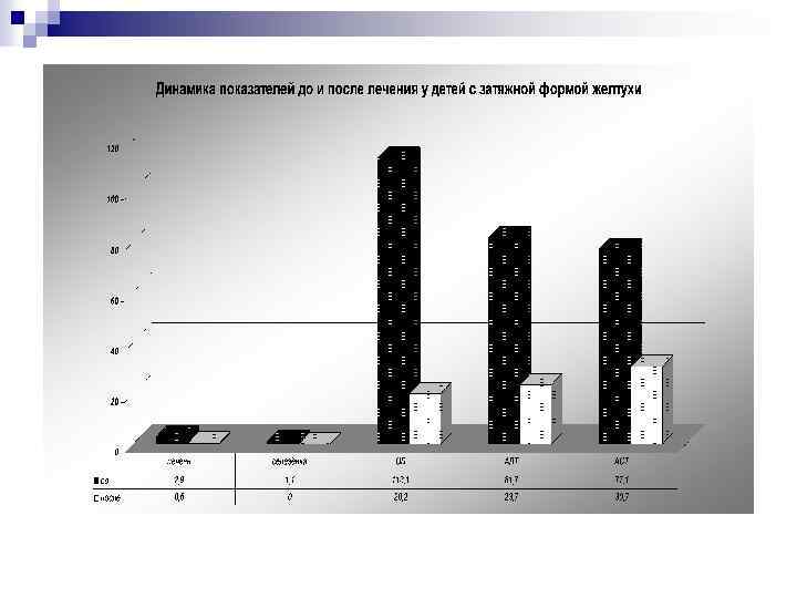 Характеристика затяжных желтух (за период 2002 -2004 гг. ) n Затяжная желтуха у 165 детей раннего возраста из 625 обследованных (26, 4%) n Длительность желтухи 52, 8± 4, 8 дня n Доношенные дети – 78, 9% n Недоношенные дети – 9, 6% n Внутриутробная гипотрофия - 11, 5% n Оценка по Апгар 7 -9 балов – 90, 4% n Грудное вскармливание – 61, 5% n Уровень общего билирубина: 4 -7 д. ж. – 149, 05± 13, 26 мкмоль/л, 1 месяц – 87, 05 ± 8, 8 n Повышение уровня трансаминаз – у 38, 5% детей n Увеличение размеров печени – у 96, 1% новорождённых