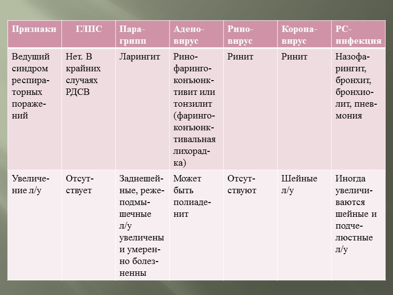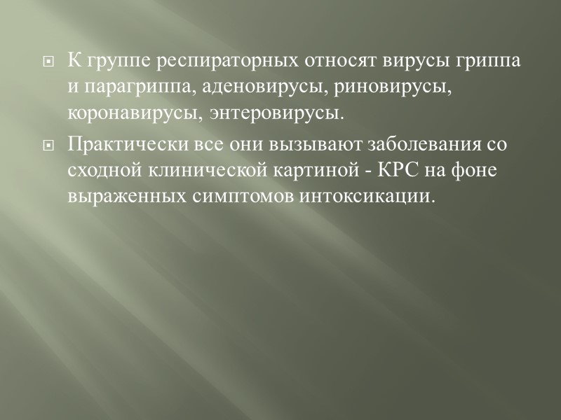 К группе респираторных относят вирусы гриппа и парагриппа, аденовирусы, риновирусы, коронавирусы, энтеровирусы. Практически все они вызывают заболевания со сходной клинической картиной - КРС на фоне выраженных симптомов интоксикации.