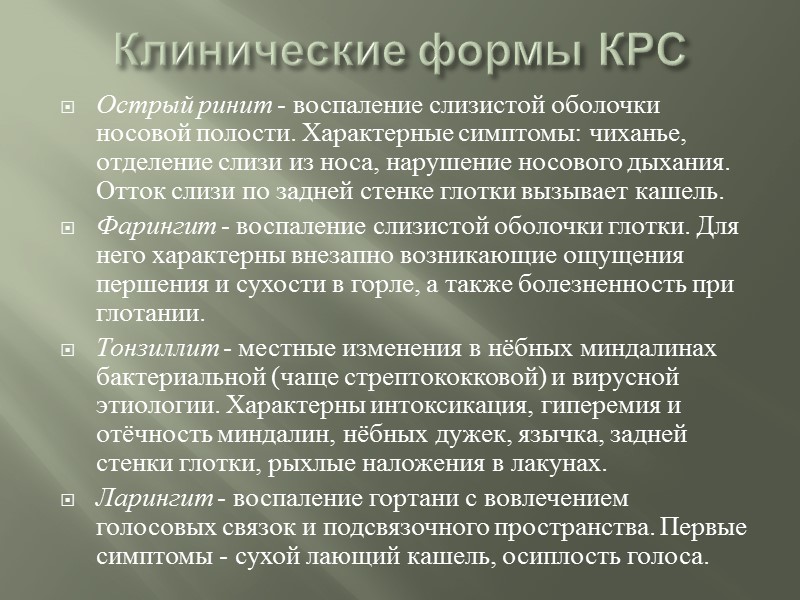 Клинические формы КРС Острый ринит - воспаление слизистой оболочки носовой полости. Характерные симптомы: чиханье, отделение слизи из носа, нарушение носового дыхания. Отток слизи по задней стенке глотки вызывает кашель. Фарингит - воспаление слизистой оболочки глотки. Для него характерны внезапно возникающие ощущения першения и сухости в горле, а также болезненность при глотании. Тонзиллит - местные изменения в нёбных миндалинах бактериальной (чаще стрептококковой) и вирусной этиологии. Характерны интоксикация, гиперемия и отёчность миндалин, нёбных дужек, язычка, задней стенки глотки, рыхлые наложения в лакунах. Ларингит - воспаление гортани с вовлечением голосовых связок и подсвязочного пространства. Первые симптомы - сухой лающий кашель, осиплость голоса.