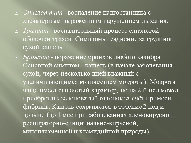 Эпиглоттит - воспаление надгортанника с характерным выраженным нарушением дыхания. Трахеит - воспалительный процесс слизистой оболочки трахеи. Симптомы: саднение за грудиной, сухой кашель. Бронхит - поражение бронхов любого калибра. Основной симптом - кашель (в начале заболевания сухой, через несколько дней влажный с увеличивающимся количеством мокроты). Мокрота чаще имеет слизистый характер, но на 2-й нед может приобретать зеленоватый оттенок за счёт примеси фибрина. Кашель сохраняется в течение 2 нед и дольше (до 1 мес при заболеваниях аденовирусной, респираторно-синцитиально-вирусной, микоплазменной и хламидийной природы).