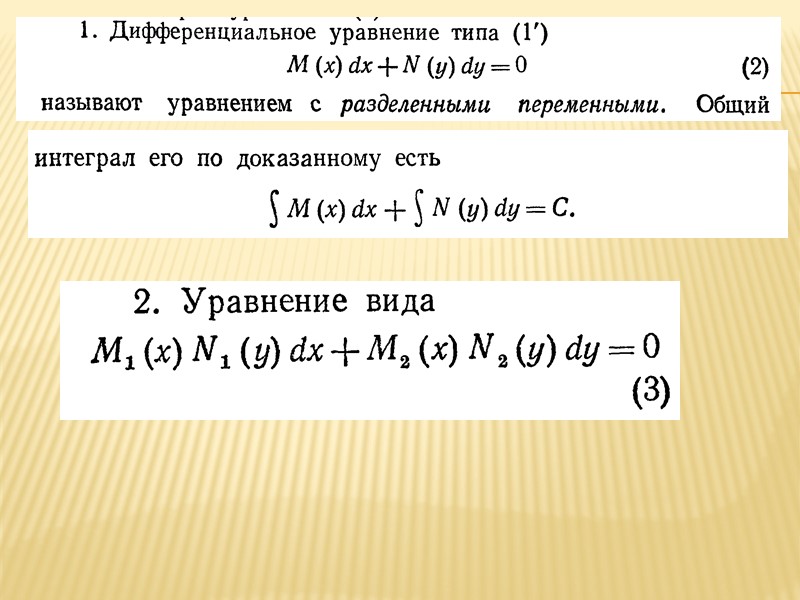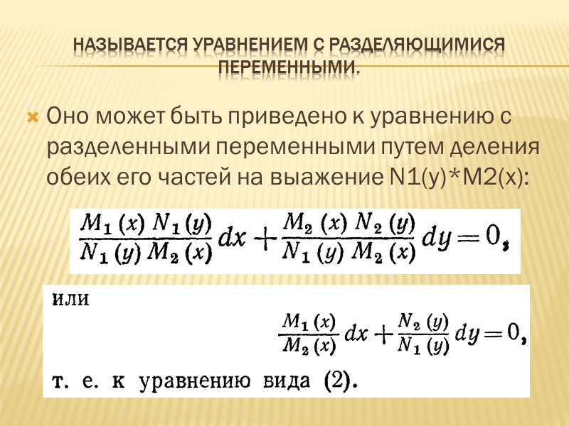 называется уравнением с разделяющимися переменными. Оно может быть приведено к уравнению с разделенными переменными путем деления обеих его частей на выажение N1(y)*M2(x):