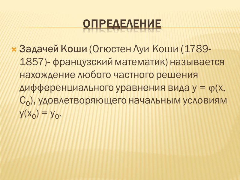 Определение Задачей Коши (Огюстен Луи Коши (1789-1857)- французский математик) называется нахождение любого частного решения дифференциального уравнения вида у = (х, С0), удовлетворяющего начальным условиям у(х0) = у0.