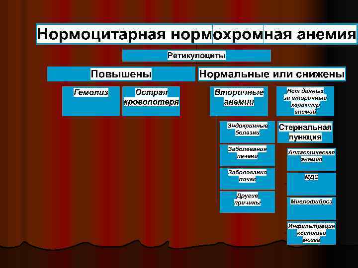 Классификация анемий l Нарушения эритропоэза Апластическая анемия l Инфильтрация костного мозга l Миелодиспластический синдром l Вторичные анемии (заболевания печени, заболевания почек, эндокринные болезни, хронические воспалительные заболевания) l